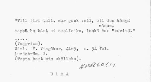 //// "Till tiri tall, mor ge ek vall, uti den kångä //// måsen, //// tappa ho "bart si skelle ko, locka ho: "kositäl" » * + //// (Vaggvisa). //// Sdml. V. Vingåker, 4165? s» 54 fol. //// Lundström, J. //// (Tappa bort min skälleko). //// ULMÅ ////