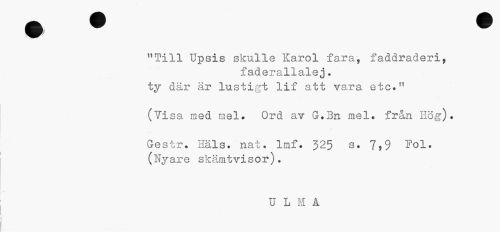 //// "Till Upsis skulle Karol fara, faddraderi, //// faderallalej * ty där är lustigt lif att vara etc*11 //// (Vi //// sa med mel. Ord av G.Bn mel. från Hög). //// Gestr. Hals. nat. Imf. J25 s. 7>9 Pol. //// (Nyare skämtvisor). //// U L M A ////
