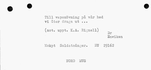 //// Till vapenövning på vår hed vi åter draga ut //// (not. uppt. K.A. Hignell) //// Dr //// Enviken //// Mskpt Soldatsånger. 3U 29162 //// HORD MUS ////