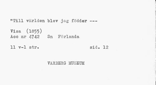 //// v //// i //// i f= //// "Till världen blev jag födder --- //// Ti sa (1855) //// Acc nr 4742 Sn Förlanda //// L //// 11 v-1 str* sid. 12 //// i //// 7arberg museum //// t //// i i ////