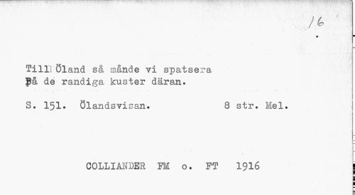 //// / £ //// te //// m ¦ //// Ti 111 Oland S cl mande Ti spatsera i //// på de randiga kuster däran. //// S. 151. ölandsvisan. 8 str. Mel. //// OOLLIANDE! FM o. FT 1916 j ////