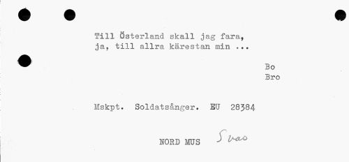 //// Till Österland skall jag fara, ja, till allra kärestan min //// Bro //// Mskpt. Soldatsånger. EU 28384 //// HORD MUS ^ ////