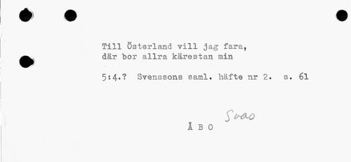 //// Till Österland vill jag fara, //// •där bor allra kärestan min //// 7 f //// 5:4*? Svenssons saml. häfte nr 2. s. 61 //// I B 0 ////