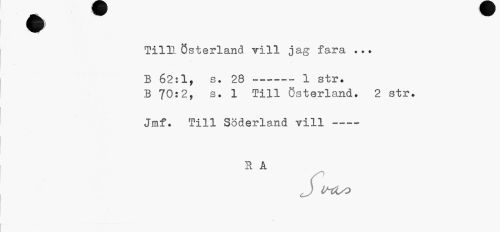 //// TilH österland vill jag fara ... //// B 62:1, s. 28---1 str. //// B 70:2, s. 1 Till Österland. 2 str. //// Jmf. Till Söderland vill --- //// R A //// J trf^o //// * ////