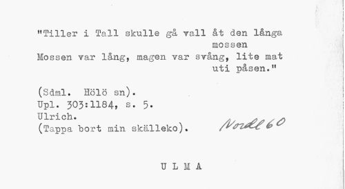 //// "Tiller i Tall skulle gå Tall åt den långa //// mossen //// Mossen Tar lång, magen Tar STång, lite mat //// uti påsen.11 //// (Sdml. Hölö sn). //// Upl. 303:1184, s. 5. 1 //// Ulrich. //// (Tappa bort min skälleko). /^r^f b c //// ULMÅ ////