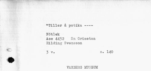 //// • • In^^rTTMmWIfTlV En11 ' -v-> V ' •.¦.¦• • :•¦ //// . .. • ¦ • . ¦ • • ' ... //// v v.. //// "Tiller å potika --- //// k * ¦ .; ? //// • ... Nötlek //// Acc 4432 Sn Grimeton Hilding Svensson //// 3 v» s. 140 //// VÅRBERG MUSEUM ////