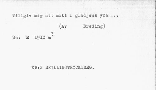 //// • . u //// Tillgiv mig att mitt i glädjens yra ... //// (åt Breding) //// Se: E 1910 m5 //// KB:S SKILLINGTRYCKSREG. ////