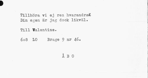 //// Tillhöra vi ej ren hvarandra£ Din egen är jag dock likväl. //// Till ¥alentine. j //// 6:8 LO Brage 9 nr 46. //// ÅBO ////
