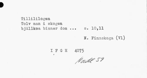 //// p //// , i //// 1 //// Tillililogen Tolv man i skogen //// bjällkoa hinner dom ... s. 10,11 //// i j //// H. Finnskoga (Yl) //// I F G H 4075 ////