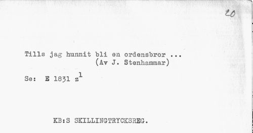 //// tö //// I \ //// Tills jag hunnit "bli en ordensbror ... //// (åv J. Stenhammar) //// Se: E 1831 z1 //// KB:S SKILLINGTRYCKSREG. //// k ////