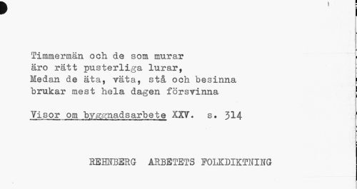//// " I //// Timmermän och de som murar ¦ äro rätt pusterliga lurar, //// Medan de äta, väta, stå och besinna j //// brukar mest hela dagen försvinna | //// Visor om byggnadsarbete XXV. s. 314 //// HEMBERG ARBETETS FOLKDIKTNING //// 4 ////