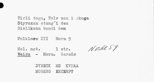 //// I //// Tirli toga, Tolv man i skoga Styruxan stung'i dem Siellkunn "bundi dem //// Folkloare III Mora. 9 //// Mel. not. 1 str. //// Yfeisu - Mora.. G ar sås //// DYBECK MS KvTAÅ MOBERG EXCERPT ////