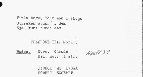 //// p //// I //// Tirlo toga, Tolv man i skoga //// Styruxan stung' i dem Sjellkuna bundi dem //// FOLKLORE III: Mora 9 //// t. //// Weisu. Mora. Garsås A/fl^ I //// Mel. not. 1 str. j //// DYBECK MS KYEÅA MOBERG EXCERPT ////