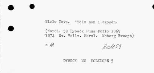 //// Tirlo Tova. "Tolv man i skogen. //// ^ (Horöl. 59 Dybeck Runa Folio 1865 //// 1874 Sv. Vallv. Hornl. Moberg Except) //// s 46 fadtW //// DYBECK MS FOLKLOHE 3 ////