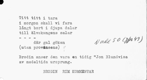 //// Titt titt i tara i morgon skall vi fara långt bort i djupa dalar till älvakungens salar //// där gal göken 4/odé Qft //// (ut an provinsens) f //// 4 //// Brodin anser den vara en tidig f,Jon Blundvisa av medeltida, ursprung. //// BRODIS RIM KOMMENTAR //// —... \ ////