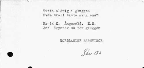 //// Titta aldrig i gluggen Hyem skall sköta mina små? //// Hr 84 E. Ångermld. E.S. //// Jmf Skymtar du för gluggen //// NORDLANDER BARNVISOR ////