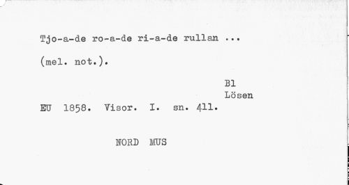 //// Tjo-a-de ro-a-de ri-a-de rullan //// i //// (mel. not.). //// Bl //// Lösen //// EU 1858. Visor. I. sn. 411. //// NORD MUS . //// ; //// i ////