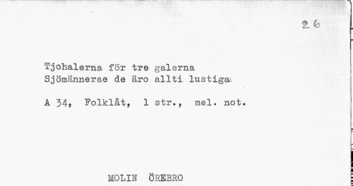 //// i: //// Tjohalerna för tre galerna Sjömännerae de äro allti lustiga- //// ... .»,••». .v * //// A 34> Folklåt, 1 str., mel. not. //// ¦ //// -_ //// MOLIN ÖREBRO [ ////