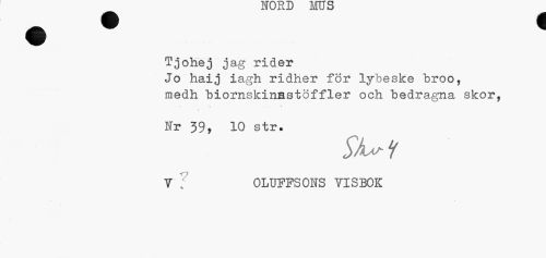 //// Tjohej jag rider //// Jo haij iagh ridher för lybeske broo, //// medh biornskinastöffler och bedragna skor, //// _ i- //// Nr 39, 10 str. //// Sk* t //// V 7 OLUFFSOHS VISBOK ////