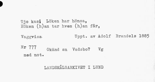 //// r //// Tjo kasj Löken har hönsa, Höken (h)an tar hvem (h)an får, //// Vaggvisa Uppt. av Adolf Brandels 1885 //// Nr 777 //// 111 Okänd sn Vadsho? Vg med not* //// LANDSMALSARKIVET I LUND ////