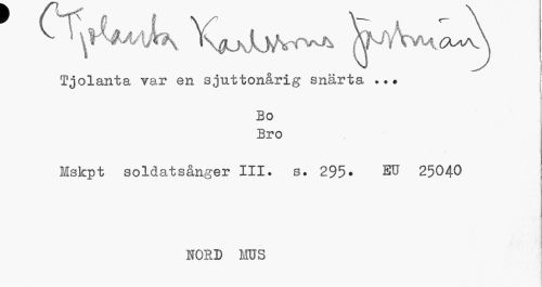 //// v T J L V Vt i - V //// Tjolanta var en sjuttonårig snärta ... //// Bo //// Bro //// Mskpt soldatsånger III. s. 295. EU 25040 //// : //// NORD MS ////