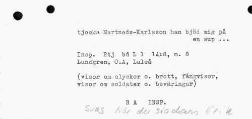 //// ) //// tjocka Martneds-Karlsson han bjöd mig på //// en sup ... //// Irisp. Rtj bd L 1 14:8, m. 8 Lundgren, O.Å, Luleå //// (visor om olyckor o. brott, fångvisor, visor om soldater o. beväringar) //// R A INSP. //// Nåt déi Sfaåé&A* #>/ & ////