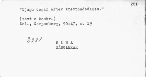 //// Zöl //// "Tjugu dagar efter trettondedagen.H //// (text o beskr.) fl //// Dal», Garpenberg, 90:471 s. 19 //// u L M A //// SÅNGLEKAR //// m //// 1 //// I //// ¦ //// ¦ ////
