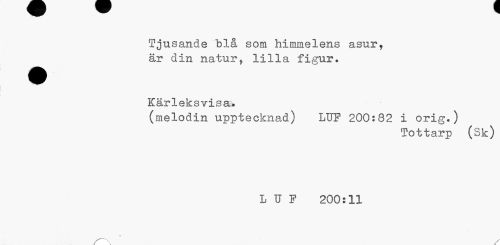 //// Tjusande blå som himmelens asur, är din natur, lilla figur. //// Kärleksvisa* //// (melodin upptecknad) LUP 200:82 i orig.) //// Tottarp (Sk) //// LUP 200:11 ////