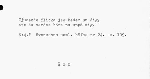 //// > //// Tjusande flicka jag beder nu dig, att du värdes höra nu uppå mig. //// « //// 6:4«? Svenssons saml. häfte nr 24» s. 109* //// ÅBO ////