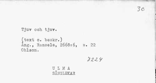 //// 3c //// I //// Tjuv och tjuv. //// (text o. beskr.) //// Ang., Ramsele, 2668:6, s. 22 //// Ohlson. //// 9 //// U L M A j //// SÅNGLEKAR ////