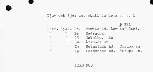 //// Tjuv och tjuv det skall du heta... 1 //// D 224 //// Lekt. 1941- Bo. Tanums hd. Lur sn. Resö. 11 u Dr. Hedemora. //// ff tf Gä Ockelbo. Mo //// !1 " Gä. Ar sunda sn. //// " " Ha. Halmstads hd. Torups sn. //// " tf Ha. Halmstads hd. Torups sn. //// NORD MUS ////