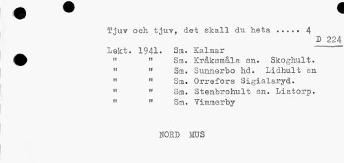 //// 0 //// Tjuv och tjuv, det skall du heta . ... 4 //// D 224 //// Lekt. 1941» Sm. Kalmar ... //// ^ tf H Sm. Kråksmåla sn. Skoghult. //// " tf Sm. Sunnerbo hd. Lidhult sn //// ft t! Sm. Orrefors Sigislaryd. //// 11 11 Sm. Stenbrohult sn. Liatorp. //// " tf Sm. Timmerby //// nord mus ////