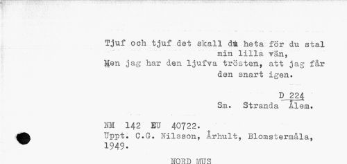 //// Tjuf och tjuf det skall dm heta för du stal //// min lilla vän, jjgen jag har den ljufva trösten, att jag får //// den snart igen. //// D 224 //// Sm. Stranda Alem. //// m 142 EU 40722. //// Uppt. C.G. Nilsson, Arhult, Blomstermåla, //// W 1949. //// nord mus ////