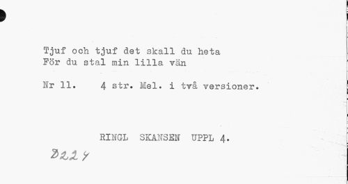 //// > ! //// Tjuf och tjuf det skall du heta //// För du stal min lilla vän f //// Nr 11. 4 str. Mel. i två versioner. j //// 1 //// ¦ //// i //// E //// RINGL SKANSEN UPPL 4. f ////
