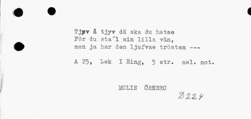 //// • • « //// Tjjrr å tjyv dä ska du hetae För du sta'l min lilla vän, ^^ men ja har den ljufvae trösten -— //// A 25, Lek I Ring, 5 str. mel. not. //// jfiji //// r MOLIN ÖREBRO ////