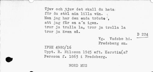 //// Tjuv och <tjuv det skall du heta //// for du stol min lilla vän. \ //// Men jag har den enda tröste , //// att jag får en a'n igen. //// tror ja tralla la, tror ja tralla la //// tror ja även så. ^ ^ //// Vg. Vadsbo hd. Fredsberg sn. //// IFGH 4980/16 //// Uppt. R. Nilsson 1945 eft. Kerstin(a? ^^ Persson f. 1863 i Fredsberg. //// 1tord mus ////