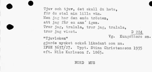 //// • v * //// Tjur och tjur, det skall du heta, //// för du stal min lXxls, van. //// Men jag har den enda trösten, //// att jag får en ann' igen. //// Tror jag, tralala, tror jag, tralala, //// tror jag visst. D //// "Tjuvleken" ¥g' KunSsäters sn. //// gjorde mycket också likadant som nu. //// IFGH 3637/27. Uppt. Stina Christensson 1935 eft. Nils Karlsson f. I865. //// NOBD MUS ////