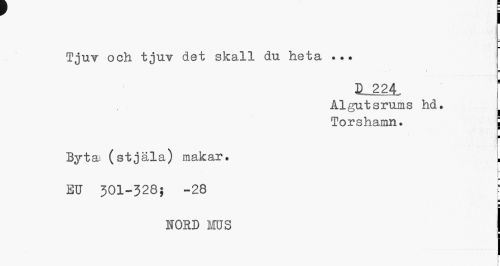 //// Tjuv och tjuv det skall du heta ... //// £-224. //// Algutsrums hd. > //// Torshamn. \ //// Byta (stjäla) makar. j, //// i //// t //// BU 301-328; -28 f //// FORD MS j //// p //// 1 ////