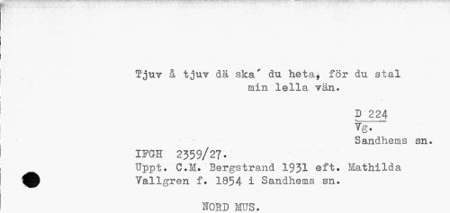 //// .. • i , //// Tjuv å tjuv dä ska' du heta, för du stal //// min lella vän. //// D 224 T g. " //// • • Sandhems sn. //// IFGH' 2359/27- //// Uppt. C.M. Bergstrand 1931 eft. Hathilda Tallgren f? 1854 i Sandhems sn. //// NORD MUS* ////