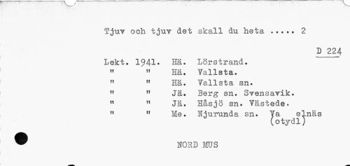 //// Tjuv och tjuv det skall du heta ... .. 2 //// D 224 //// Lekt. 1941* Hä. Lörstrand. //// " 11 Hä. Yallsta. //// ft tf Hä. Yallsta sn. //// ^ J cl • Berg sn. Svensavik. //// f< 11 Jä. Håsjö sn. Västede. //// " 11 Me. Njurunda sn. Ya elnäs //// (otydl) //// ® NORD MS ////