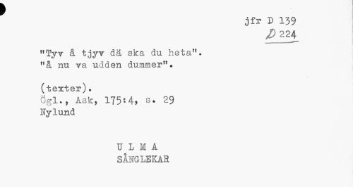 //// f //// jfr D 139 //// £> 224 //// "Tyr å tjyv dä ska du heta", "å nu va udden duaimer". //// (texter). //// Ögl., Ask, 175--4, s. 29 //// Nylund //// U L M A SÅNGLEKAR ////