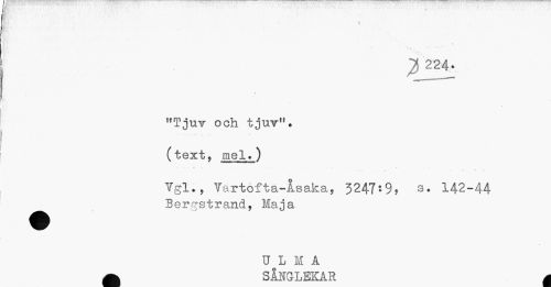 //// A //// ^ 22t //// "Tjuv och tjuv". //// (text, mel.) //// . . ... //// Vgl•, Yartöfta-Asaka, 3247-9? s. 142-44 //// ^^ Bergstrand, Maja //// U L M A ////