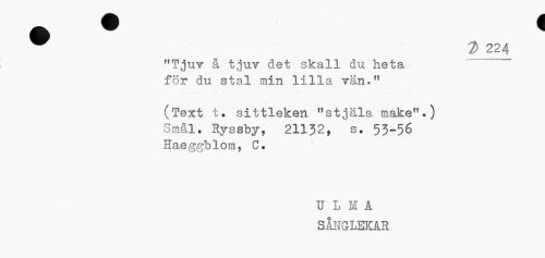 //// ® 7> 224 //// "Tjuv å tjuv det skall du heta ~~ //// för du stal min lilla vän." //// (Text t. sittleken "stjäla make".) Smal. Ryssby, 21132, s. 53-56 //// Haeggblom, C. //// U L M A //// SÅNGLEKAR ////