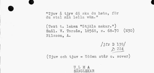 //// "Tjuv å tjyv dä ska du heta, för du stal min lella vän.11 //// (Text t. leken "Stjäla makar.") Smål. V. Torsås, 18568, s. 68-70 (M30) Nilsson, A. //// /jfr D 139/ //// >5 224 //// (Tjuv och tjuv = Udden står o. sover) //// U L M A SANGLEKAR ////