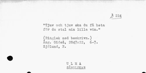 //// 224 //// "Tjuv och tjuv ska du få heta för du stal min lilla vän." //// (Ringlek med beskrivn.) ing. Gideå, 2847:22, 6~7* Sjölund, R. //// U L M A SÅNGLEKAR ////