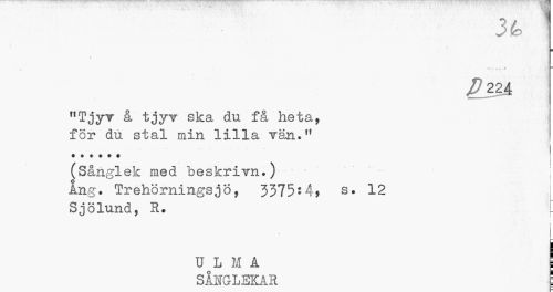 //// 3 to //// ... i- -^ 2? i //// "Tjyv å tjyv ska du få heta, för du stal min //// lilla van." //// (Sånglek med beskrivn.) //// Ang. Trehörningsjö, 33755 4» s. 12 //// Sjölund, R. //// v //// Dill ! //// SÅNGLEKAR g ////