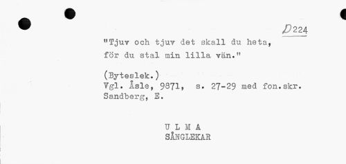 //// ® Z?224 //// "Tjuv och tjuv det skall du heta, för du stal min lilla vän." //// (Byteslek.) //// Ygl. Äsle, 9871, s. 27-29 med fon.skr. Sandberg, E. //// U L M A SÅNGLEKAR ////