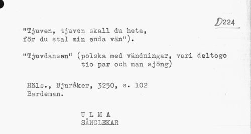 //// <£>224 //// "Tjuven, tjuven skall du heta, för du stal min enda vän"). //// "Tjuvdansen" (polska med vändningar, vari deltogo //// tio par och man sjöng) //// Häls., Bjuråker, 3250, s. 102 Bardeman. //// U L M A SÅNGLEKAR ////