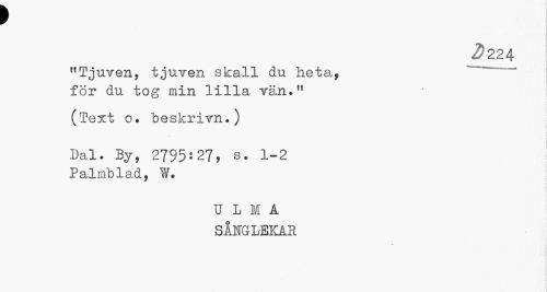//// I //// 2)224 //// "Tjuven, tjuven skall du heta, för du tog min lilla vän." //// (Text o. beskrim.) //// Dal. By, 2795:27, s. 1-2 Palmblad, W. //// U L M A SÅNGLEKAR ////