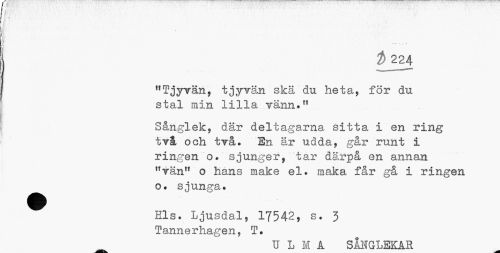 //// ¦ //// • ; . . s //// ^ 224 //// "Tjyvän, tjyvän skä du heta, för du stal min lilla vann." //// Sånglek, där deltagarna sitta i en ring två och två. En är udda, går runt i ringen o. sjunger, tar därpå en annan "vän" o hans make el. maka får gå i ringen o. sjunga. //// Els. Ljusdal, 17542, s. 3 Tannerhagen, T. //// o ////